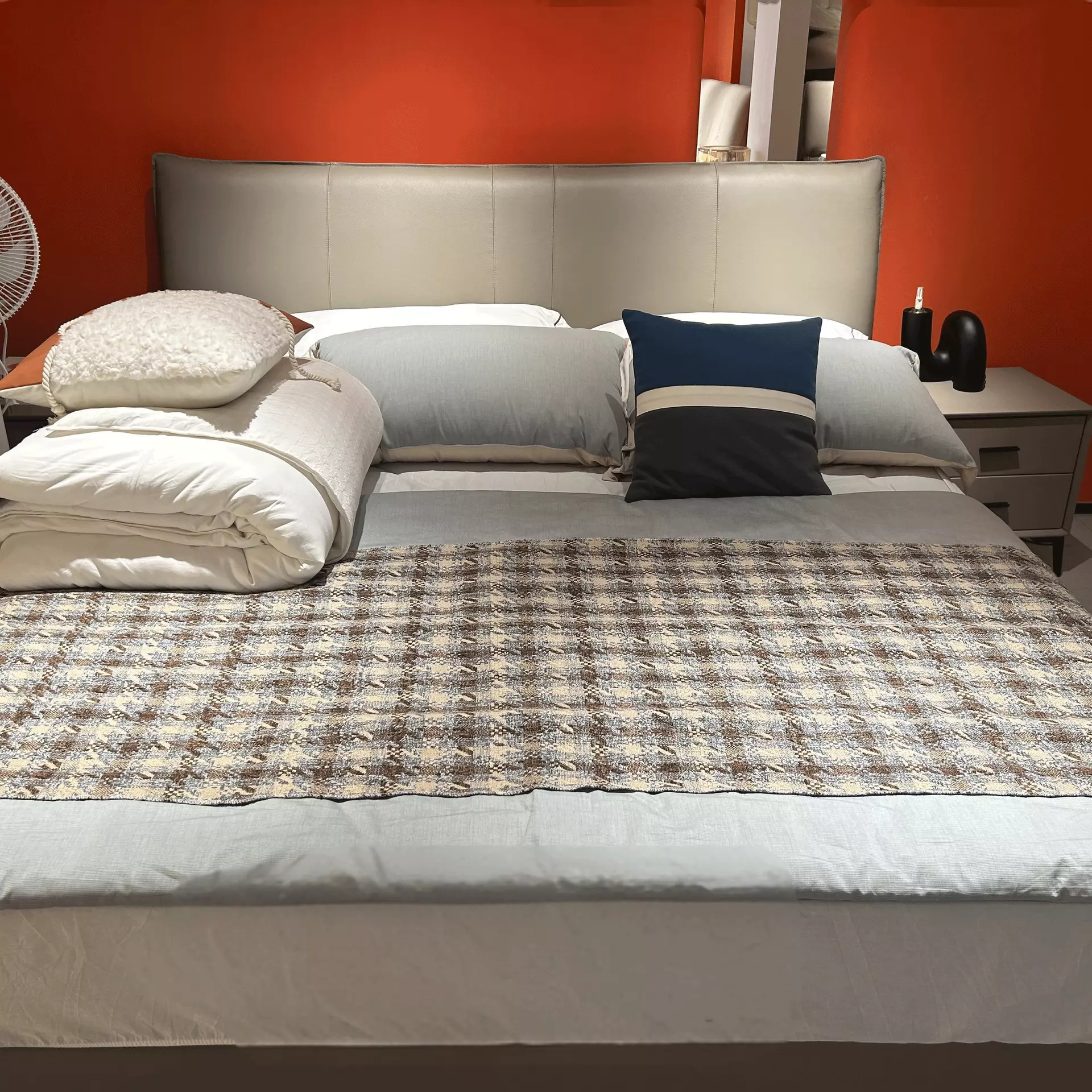 1: The headboard is made of thickened top-grain cowhide, featuring a warm light-brown finish, high-density memory foam, a Russian larch frame, and 2.5 cm thick metal legs.